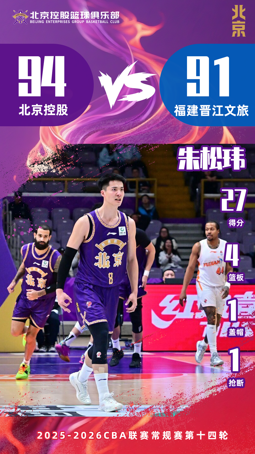 1.121月12日,北控男篮坐镇主场迎战福建晋江文旅。本场比赛球队开局进攻流畅防守严密,一度领先对手多达21分。下半场福建男篮进攻回暖,凭借曾凌铉连续三分命中一度追平比分。关键时刻廖三宁挺身而出,用一记三分绝杀帮助球队以94:91收获关键胜利。数据方面,朱松玮拿下全队最高的27分;里勒稳定发挥斩获26分5助攻2抢断,廖三宁奉献11分10助攻的两双数据。最佳数...